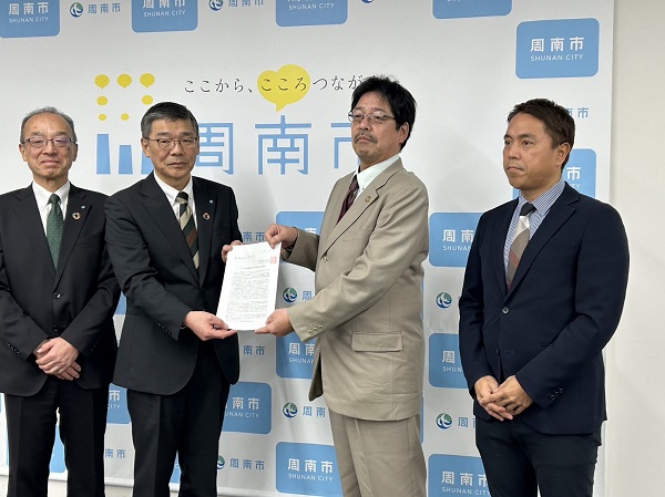 周南市の道源副市長・厚東教育長へ要望書を渡す松本委員長