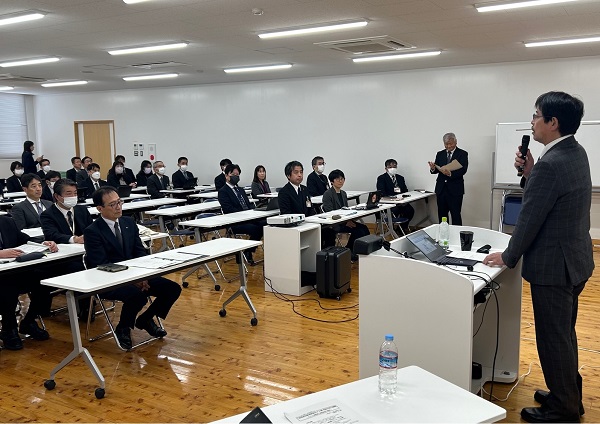 美祢市との学習懇談会で講演する川口書記長
